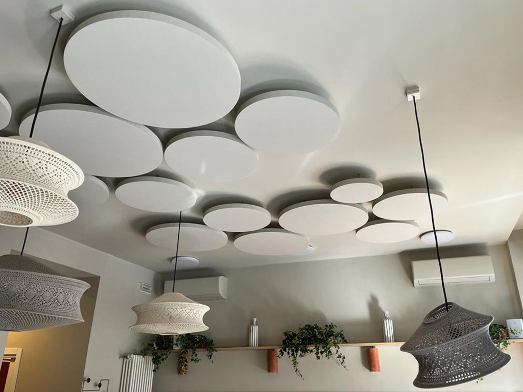 Schallabsorbierendes System DESIGN mit deckenmontierten Paneelen